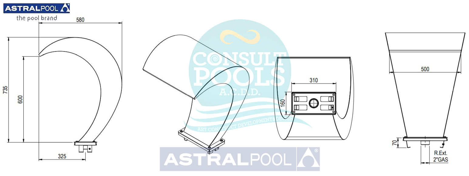Caracteristici tehnice cascada piscina model clasic AISI-316, 325 mm * 500 mm, 2 ",h 735 mm, a 580 mm Astral Pool cod produs 57095: