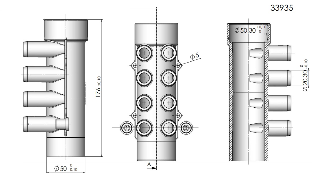 Distribuitor pentru lipire la teava de 50 mm si 8 iesiri care se conecteaza la furtunul flexibil cu diametru intern de 20 mm.