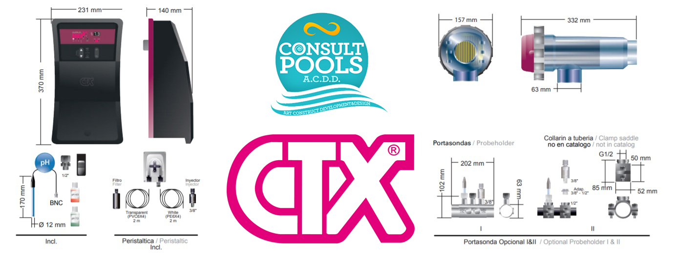 Elemente componente Electrolizor de sare CTX Go Salt-40pH, volum de apa 160 - 180 mc, pompa dozatoare pH, CTX Professional Spania cod produs 70308: