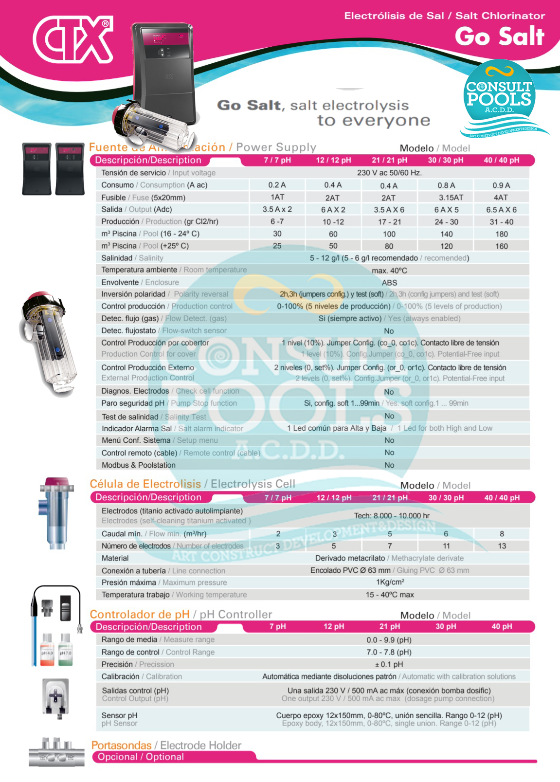 Descriere celula electrolitica CTX Go Salt-40pH, volum de apa 160 - 180 mc, pompa dozatoare pH, CTX Professional Spania cod produs 70308: