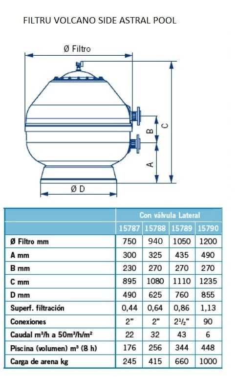 filtre side: 15787 - Filtru VESUBIO Side D750; 15789 - Filtru VESUBIO D1050; 15790 - Filtru VESUBIO Side D1200.Nota: produs compatibil cu pompa de filtrare de la Astral Pool Victoria Plus 38780