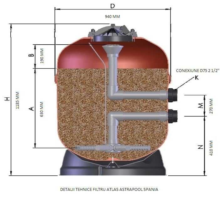 Filtru cu nisip prevazut cu vana multiport manuala cu 6 cai. Temperatura maxima a apei 40 grade. Presiune maxima de lucru 2kg/cm2 . Viteza maxima de filtrare 50mc3/h/m2.