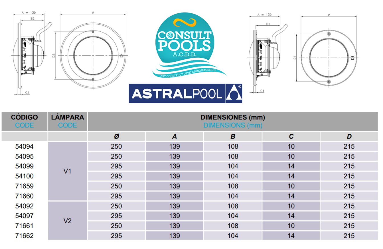 SKU: 54103In stocLivrare: 5 - 10 zileProiector piscina, otel inoxidabil, leduri RGB, 48 W (64VA), lumeni 2544 lm, rama 250 mm, IPX8, PAR56 LumiPlus AstralPool Spania
