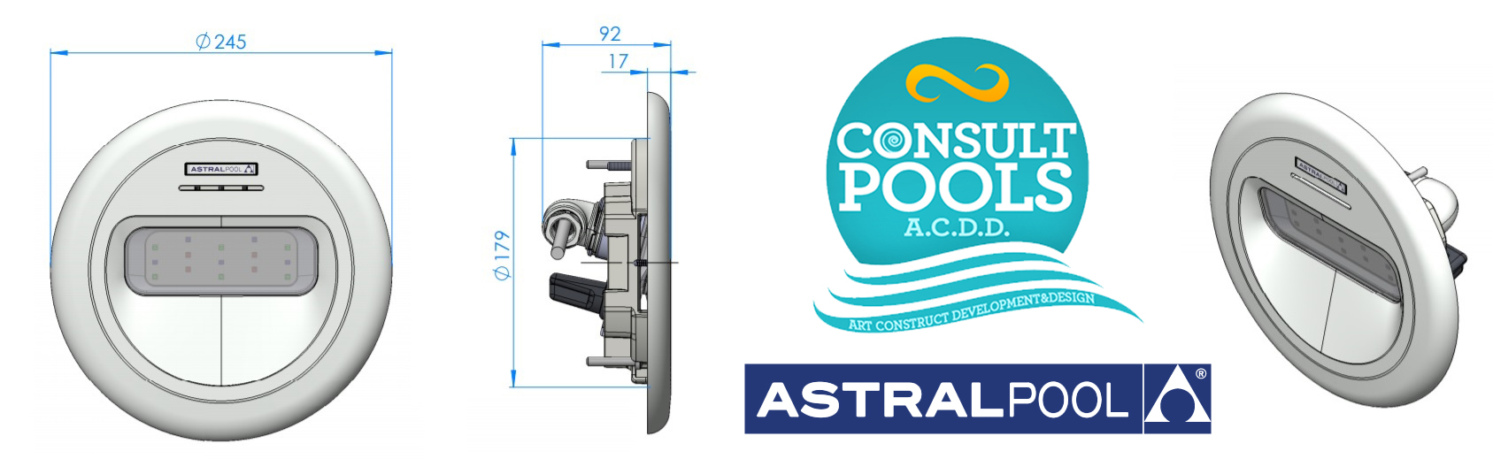Proiector reflector piscina Design, leduri albe, 45 W (50VA), lumeni 4320 lm,IPX8 LumiPlus AstralPool
