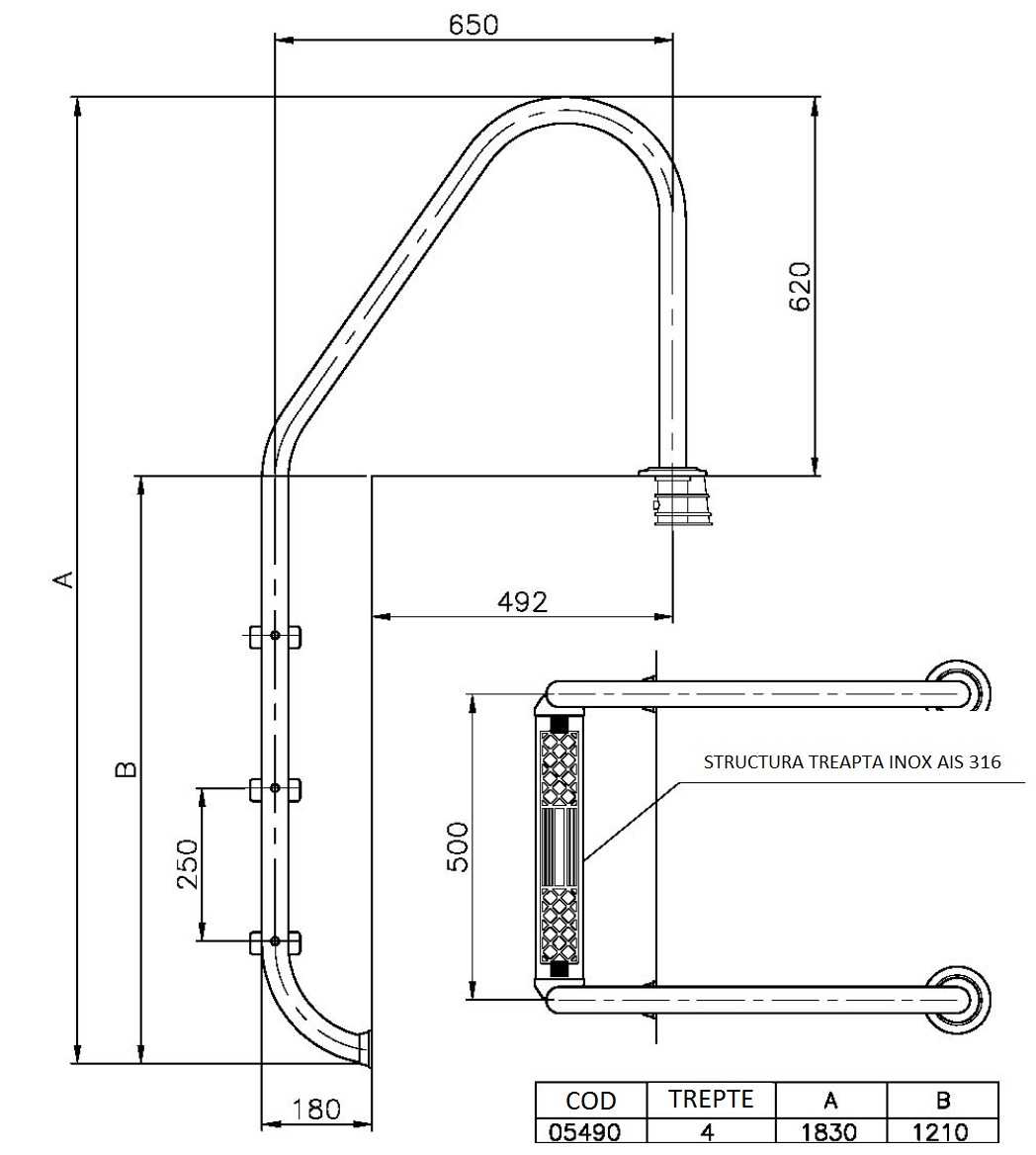 Produs accesoriu oferit de catre cei de la Astral Pool Spania pentru piscinele si bazinele cu apa dulce. Realizata din inox AISI-304. Acest model de scara se recomanda a fi utilizata numai in medii cu apa dulce.