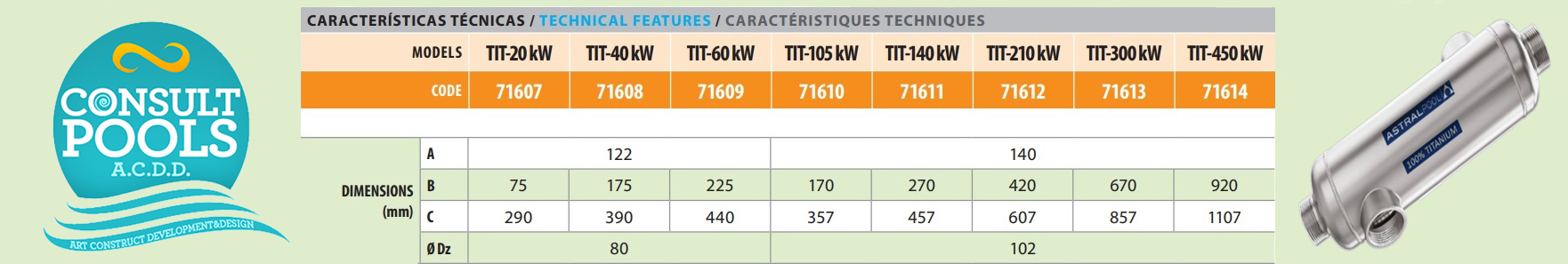 Specificatii tehnice Schimbator de caldura titan 20 kW, Waterheat EVO TIT-20 kW, conexiune secundara apa piscina 1", conexiune primara agent termic 3/4 " AstralPool Spania cod produs 71607: