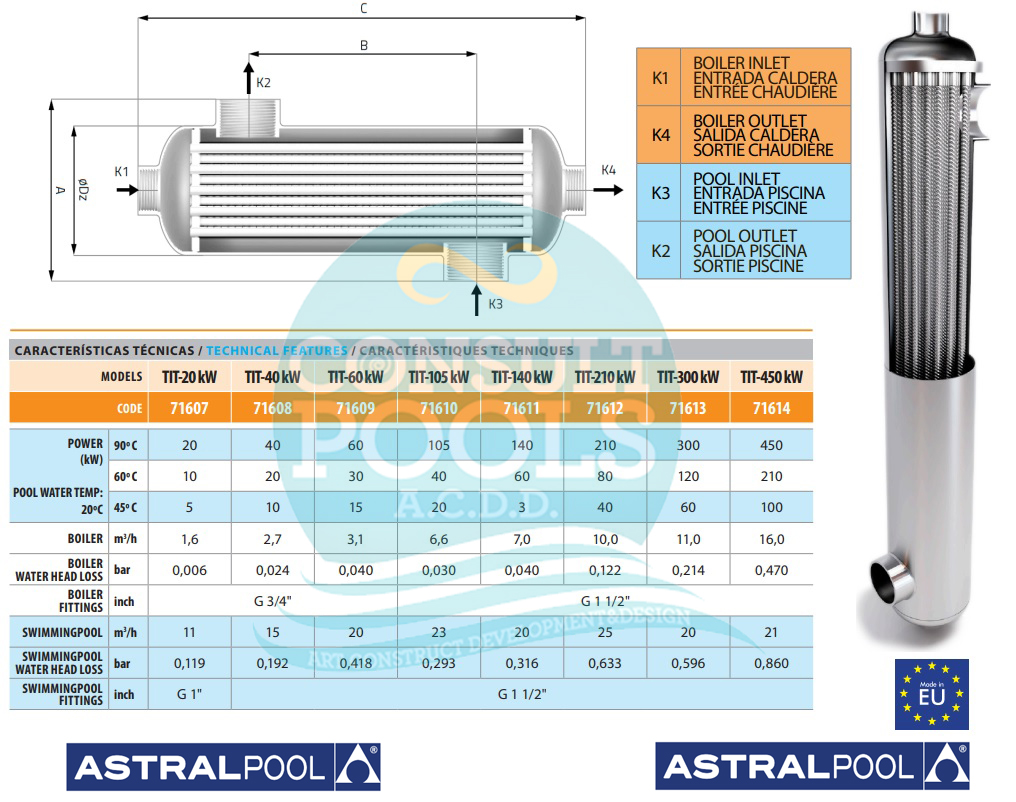Schimbator de caldura titan 20 kW, Waterheat EVO TIT-20 kW, conexiune secundara apa piscina 1", conexiune primara agent termic 3/4 " AstralPool Spania