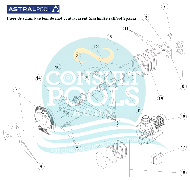 Pentru achizitionarea pieselor de schimb pentru sistemele de inot contracurent Marlin comercializate de catre cei de la AstralPool Spania va rugam frumos sa va ghidati dupa imaginea explodata de mai jos. Odata identificata pozitia de care aveti nevoie puneti in cosul de cumparaturi pompa cod 65569 iar la observatii treceti piesa de schimb necesara, identificata dupa numarul pozitiei.